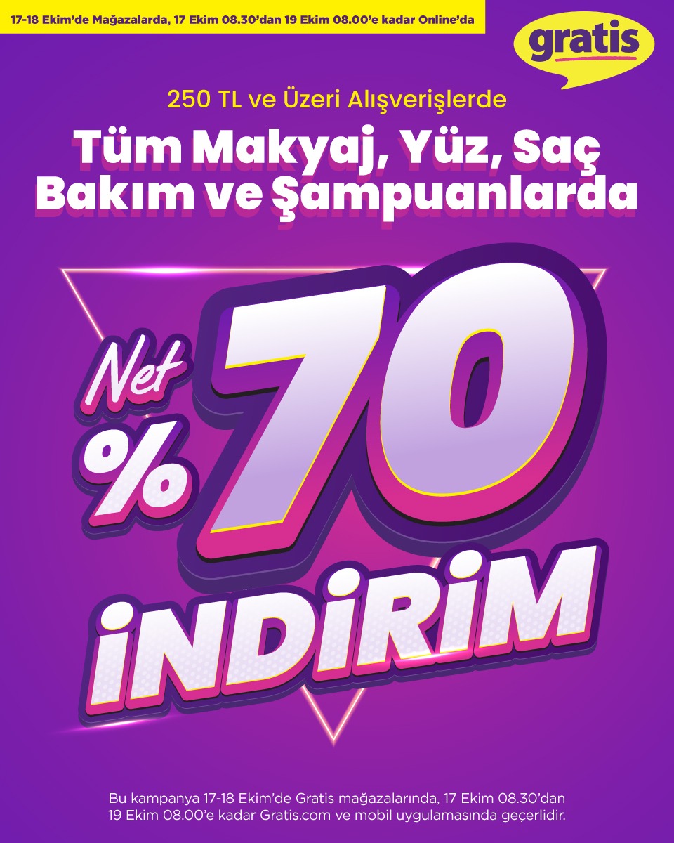 17-18 ekim'de gratis'ten 250 TL üzeri tüm makyaj, Yüz, Saç bakımı ve şampuanlarda Net %70 indirim. 17 Ekim 2025, 11:22