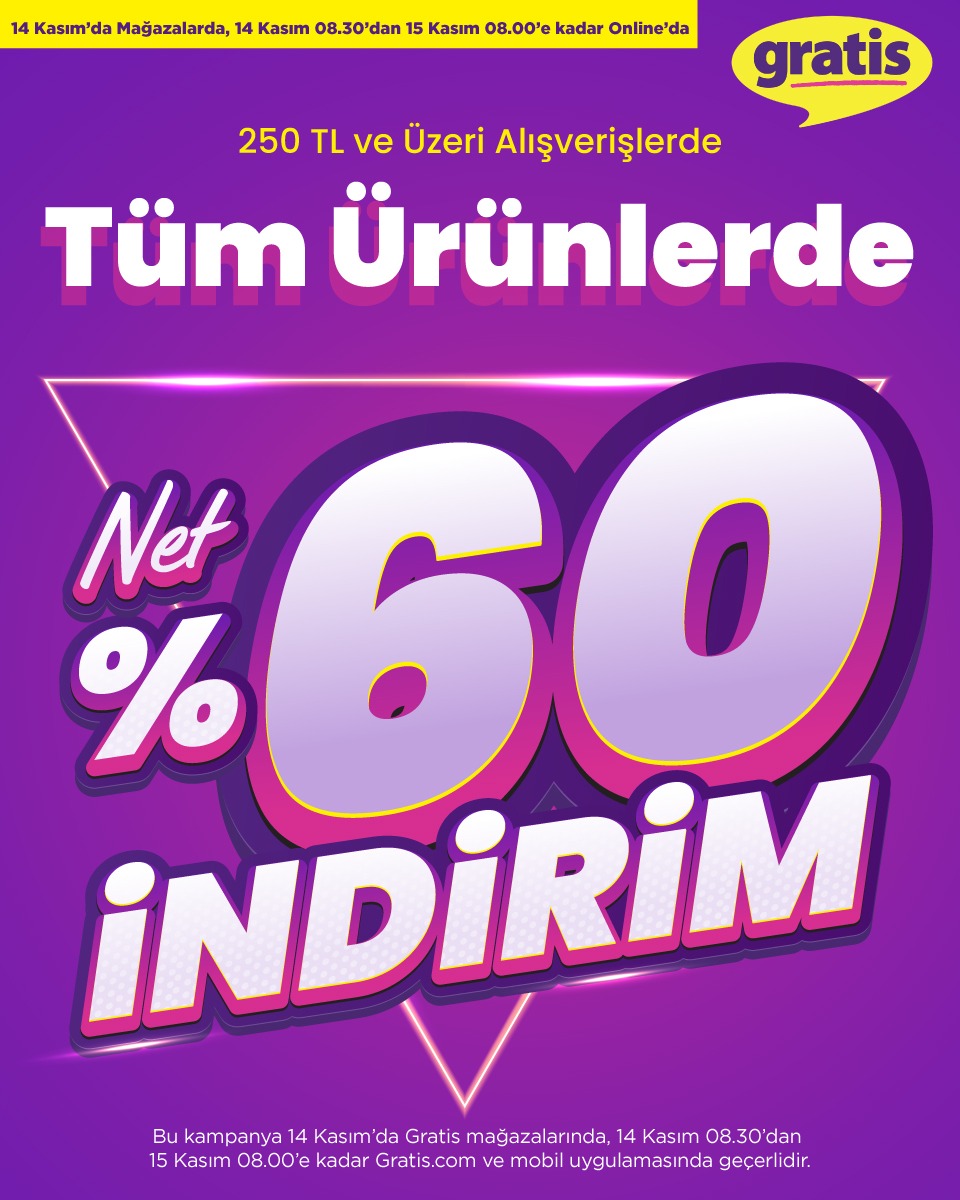 Gratis'te 14 Kasım'da 250 TL ve üzeri alışverişlerde tüm ürünlerde %60 indirim. 14 Kasım 2025, 14:22