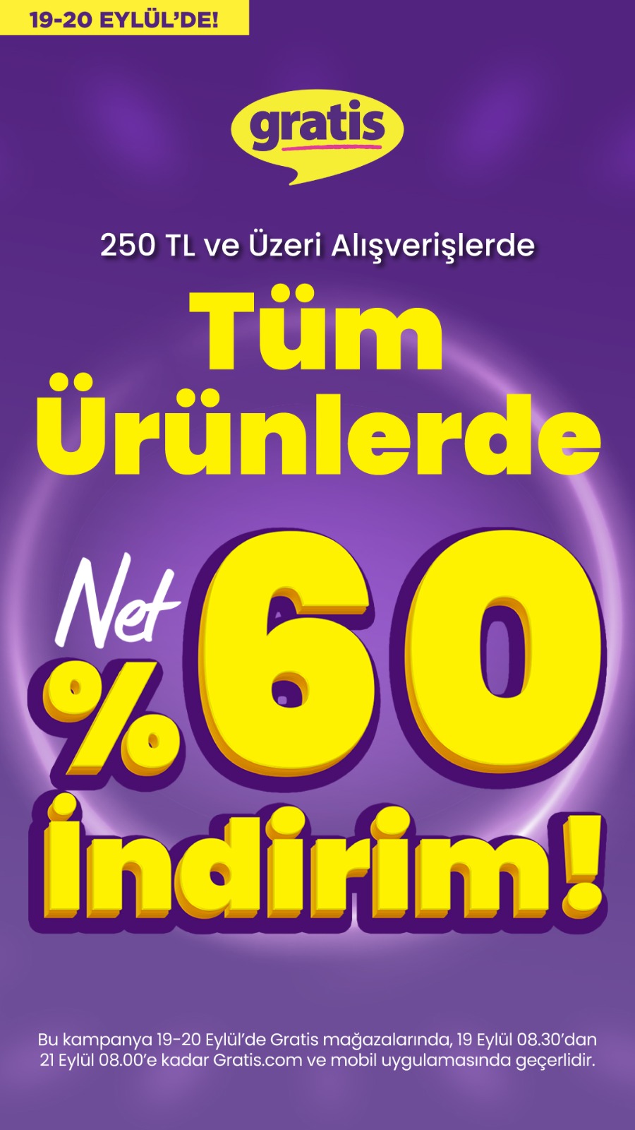 Gratis'te 19-20 eylülde 250 tl ve üzri alışverişlerde tüm ürünlerde net %60 indirim. 19 Eylül 2025, 12:06