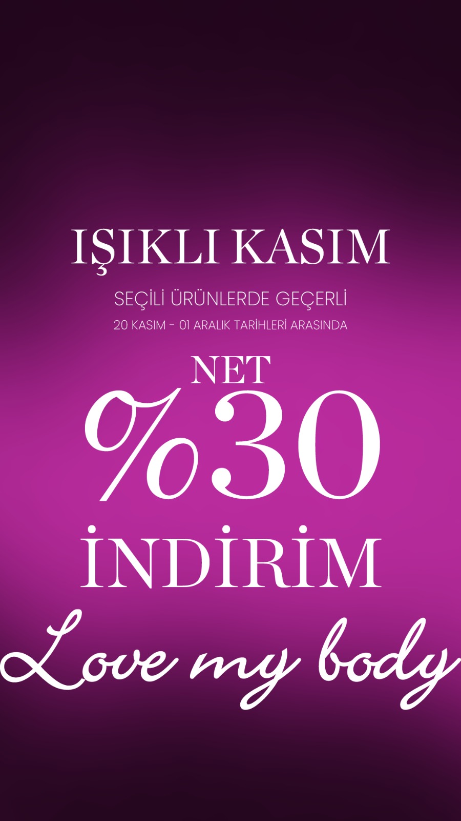 Love my Body'de IŞIKLI KASIM seçili ürünlerde geçerli NET %30 İNDİRİM. 24 Kasım 2025, 13:29