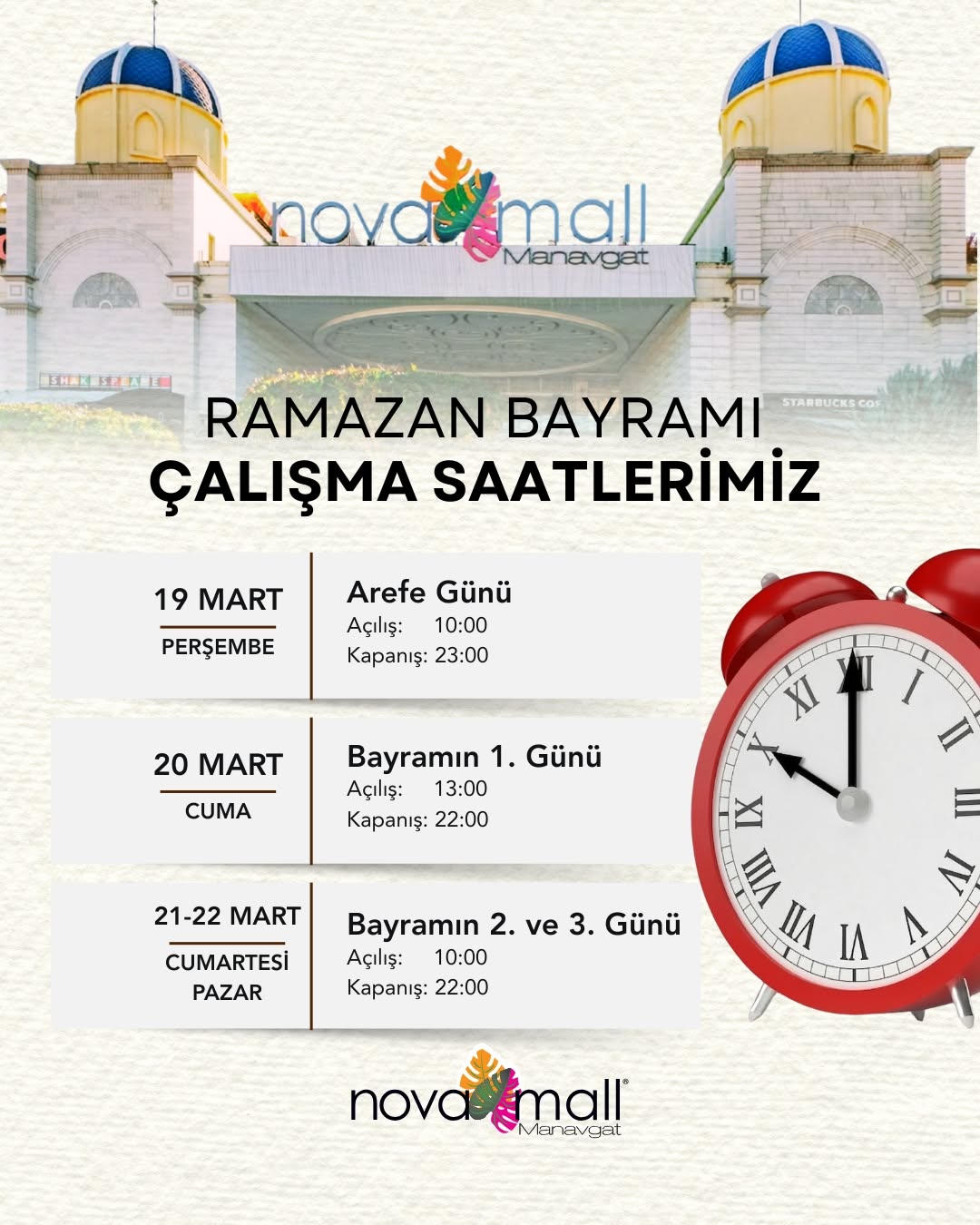 Değerli Misafirlerimiz, Ramazan Bayramı coşkusunu hep birlikte yaşamak için Novamall Manavgat olarak hizmetinizdeyiz!