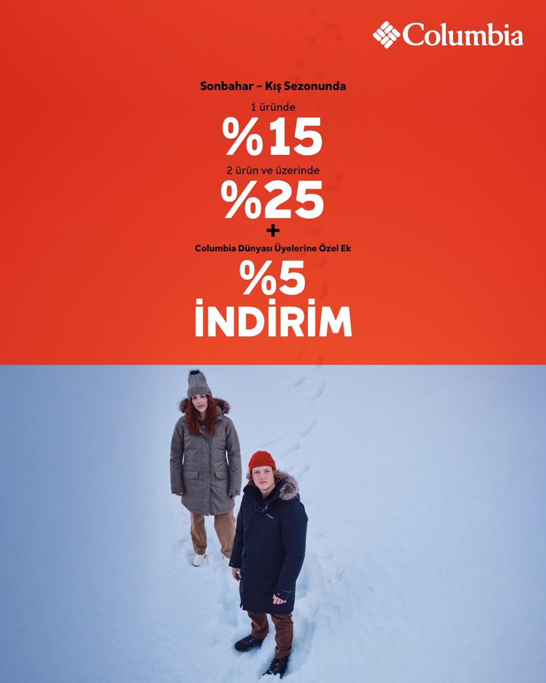 1 üründe %15, 2 ürün ve üzerinde %25 indirime ek Columbia Dünyası üyelerine özel %5 indirim. 04 Aralık 2025, 13:53