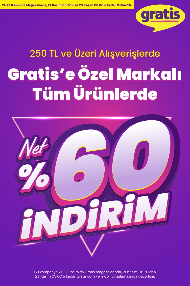 21-22 Kasım'da 250 TL ve Üzeri Alışverişlerde Gratis'e Özel Markalı Tüm Ürünlerde %60 İNDİRİM