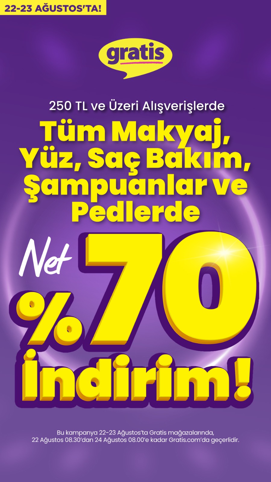 Gratis'te 22-23 Ağustos'ta Net %70 indirim Fırsatı 22 Ağustos 2025, 17:57